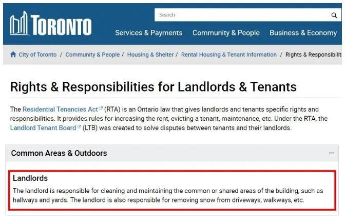 根据安省《住宅租赁法》(RTA)规定:房东要负责清洁和维护物业的外部公共或共享区域,如走廊和院子。房东还要负责清除车道、人行道上的积雪等。