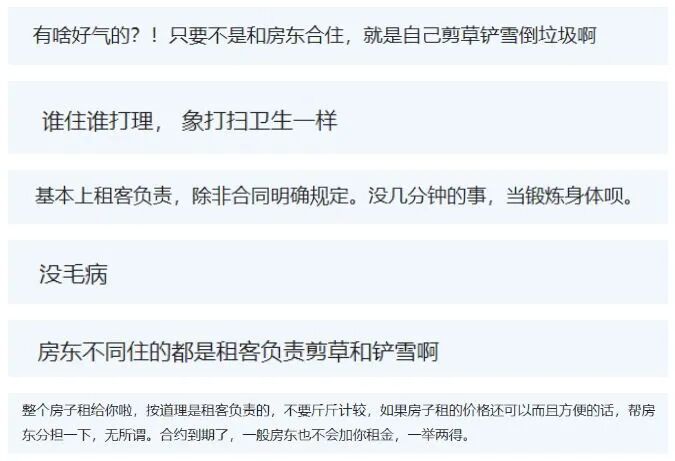 有人表示,只要不是和房东合住,除草、铲雪、打扫卫生和倒垃圾都应该由租客自己负责。