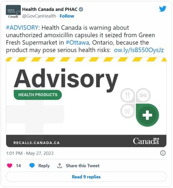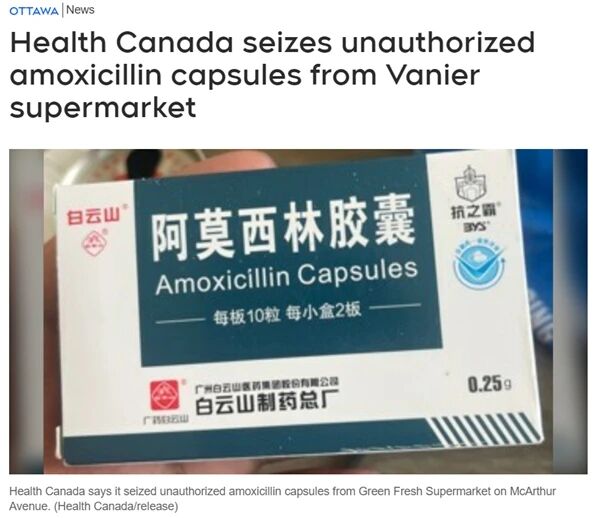“如果你从这家超市购买了未经授权的阿莫西林胶囊,加拿大卫生部建议你不要使用该产品,并将其退回给当地药店进行妥善处理。”