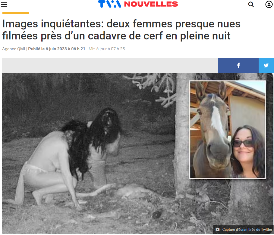 有网友说,这其实是披着人皮的恶魔,并警告Corinea千万不要靠近她们,只要靠近就会死亡。一位网友写道“这是来着地狱的恶魔,如果你听到尖叫声,拿着枪躲在家里,千万别回应。”还有一位自称爱好研究神秘主义的网友推测,这些赤身裸体的女性是Wendigos,即美国土著鬼魂,能附身于在人类身上,并将人类变成食人族。“这种生物在阿尔冈坤奥吉布韦人、东克里人、索尔托人、韦斯特曼沼泽克里人、纳斯卡皮人和因努人中都有记载。”“这些族群或文化对Wendigo的描述会有不同,但共同点是wendigo是邪恶的,吃人的,超自然的生物。与冬天,北方,寒冷和饥荒密切相关。”反正现在对于这两个女性的说法各有各的不同,一个比一个邪乎。Corinea更希望这是两人的恶作剧——可能他们是在白天散步时看到了这里设置了相机,所以晚上可能在嗨了之后故意把自己打扮得人不人,鬼不鬼的来跟自己开个玩笑?https://www.tvanouvelles.ca/2023/06/06/images-inquietantes-deux-femmes-presque-nues-filmees-pres-dun-cadavre-de-cerf-en-pleine-nuit
