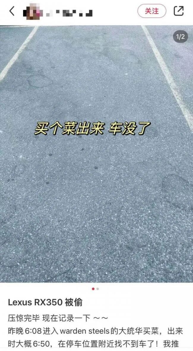 多伦多一位华人近日爆料:自己的车在光天化日之下被偷!更令人是震惊的是盗贼的作案速度——爆料者只是进超市买了个菜,出来后车就没了,只剩一个空荡荡的车位!