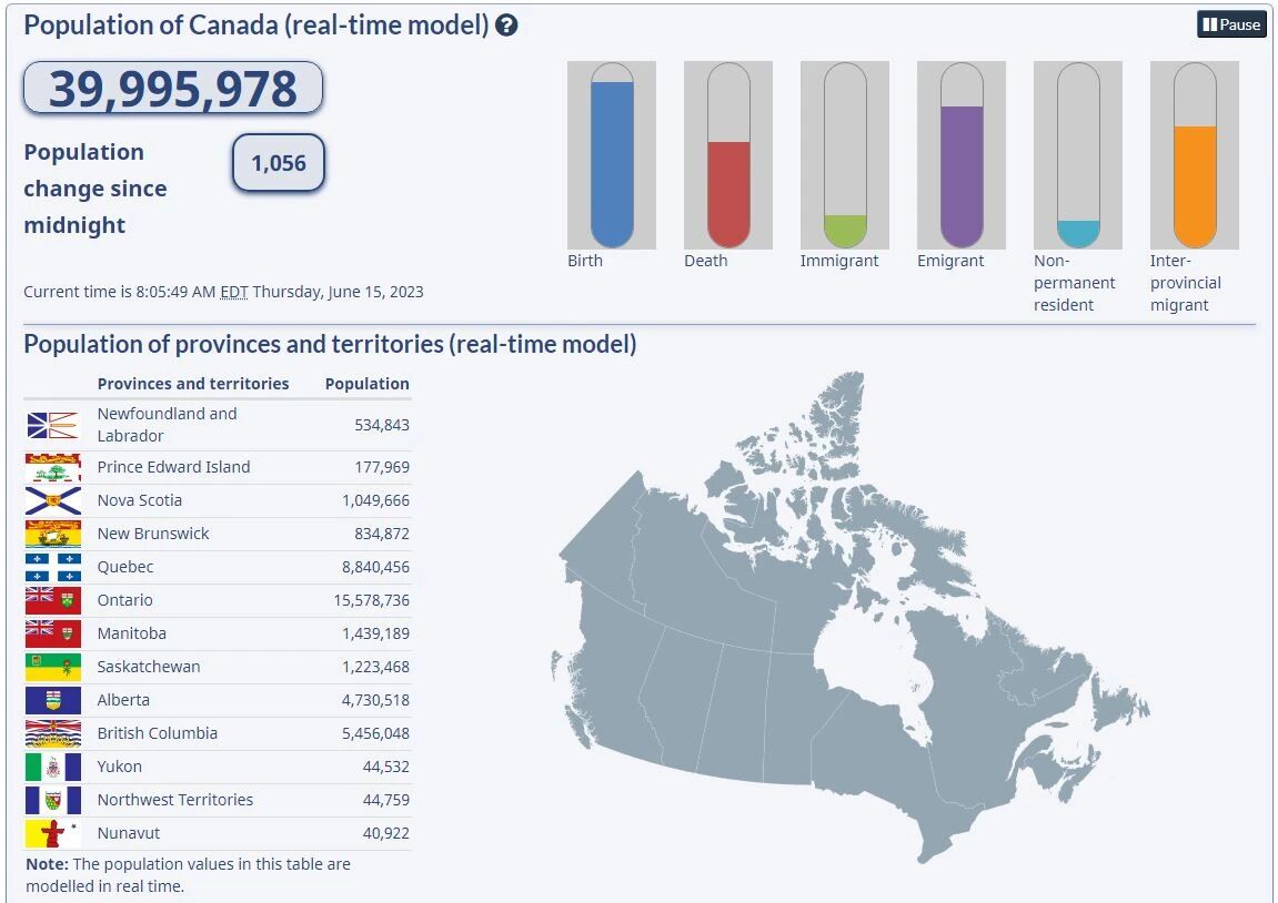 在加拿大人口即将达到“4000万”里程碑之际,加拿大统计局推出一款“时钟”,你可以实时查看加拿大人口的具体变化。“加拿大人口追踪器/实时计数器”考虑了出生、死亡、移民(出入)、非永久居民以及居民省际迁移等多项因素。这意味着,其所显示的数字并非一味地上升。截至发稿,加拿大目前人口为39,995,978。从省和地区看,安省人最多,超过1550万;魁省第二,超过880万;BC省第三,超过540万。据小编观察,昨日下午加拿大人口数为39,993,532,至今早净增了大约2500人。照此推断,如果不出意外的话,加拿大人口会在本周末,尤其可能是周六的某时某刻,跨越4000万!小编建议:打开链接后,请别“看一眼”就关——指标的实时变化定会引发你许多有趣的思考……比如小编看后就想吟:万里人南去,三春雁北飞。不知何岁月,得与尔同归?哎,应该是小编想多了。小编的意思是:生老病死世事无常,人生几度秋凉。