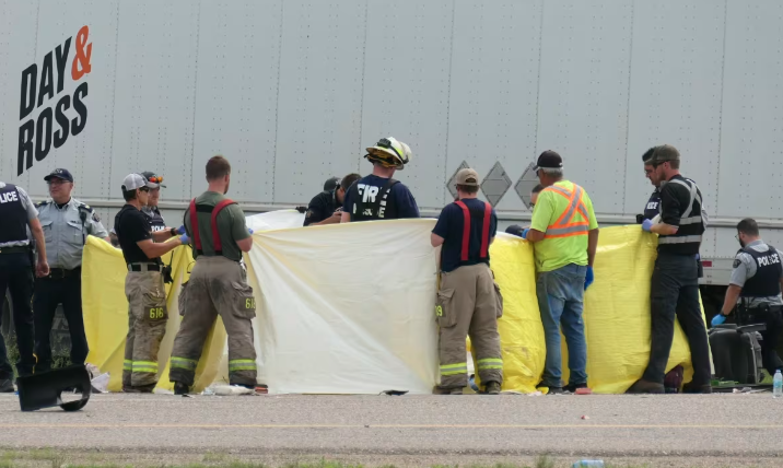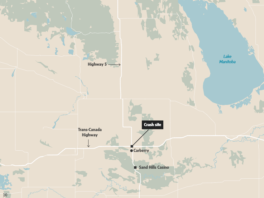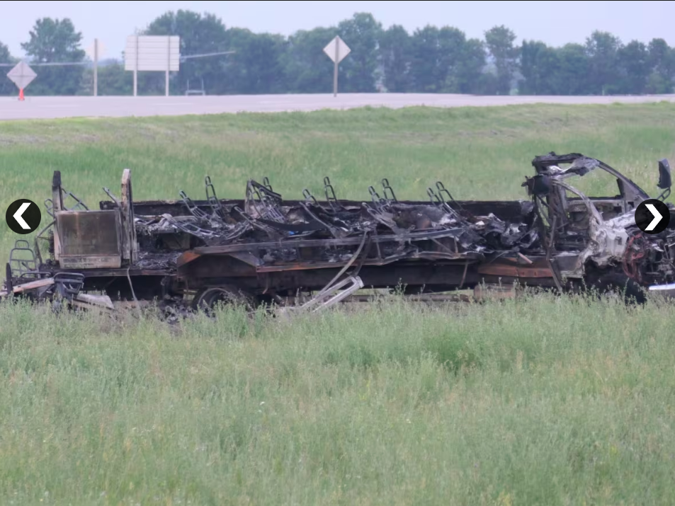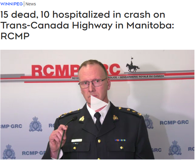 今早,多家媒体更新消息称,车祸已造成15人死亡,另有10人重伤。曼尼托巴省皇家骑警表示,周四上午约11点43分左右,警方接到报警,称一辆载有大约25人的中型公共汽车在1号高速公路和5号高速公路上与一辆半挂卡车相撞,地点靠近Carberry镇,这里距离温尼伯以西大约2小时车程。这辆公交车上的乘客,大部分都是来自Dauphin市及周边地区的老年人。Dauphin市位于Carberry大约150公里处。Carberry的Sand Hills Casino赌场发言人证实,这辆巴士当时正在前往该赌场,快要抵达时发生车祸。现场图片显示,蓝色半挂卡车前端被撞扁,并烧毁。在路边的草地上,有一辆已全部烧焦,几乎只剩下底盘骨架的车骸,难以辨认车型。据报道,当地消防局事后确认,被烧毁的车辆是一辆白色外壳的“Handi-Transit”中型客车。“Handi-Transit”隶属于公共交通系统,主要为那些因残疾而无法使用常规公交车的人士提供服务。当地急救部门STARS共派出了12辆救护车,14名重症监护医务人员,两架空中医疗救援机,和两架运输直升机。STARS发言人布莱克罗伯特表示,这是该紧急服务中心有史以来所遇到的最大规模的救援行动。救援人员赶到后,为躺在路边的受害者尸体盖上毯子,并将10名伤者分别送往四家医院。Shared Health首席执行官Lanette Siragusa在新闻发布会上说,“大多数幸存者要么是脑外伤,要么是骨科创伤,要么是两者兼具,情况严峻。”“我们启动了‘大规模伤亡应对措施’,多家医院的急诊科,外科和重症监护团队都已在患者到来前就做好了准备。”现场散落着大量受害者的个人物品,如轮椅,行走辅助器等。救援人员在现场用蓝色床单覆盖受害者的尸体,并在公路上散落的碎片旁边摆上黄色标牌,以标记相关证据。Ron Bretecher说,他的父母都在这辆车上……他的母亲受伤,目前正在温尼伯健康科学中心住院治疗,他的父亲……目前下落不明。Bretecher说:“整个周四晚上我们全家人都在等待消息,太煎熬了。”如上图所示,在与大货车发生碰撞后,公交车被甩出很远。公交车燃起的火焰将周边草地点燃。据悉,半挂卡车上绘有卡车运输公司“Day & Ross”的标志。周四,这家货运公司没有立即回复置评电话。稍晚时候,Day & Ross卡车运输公司首席执行官William Doherty发布了短暂的声明:“整个Day & Ross团队都与在这起可怕事件中失去亲人的人们同在,我们对受伤者的康复抱有希望。”“目前,我们从现场获得的细节有限。在了解更多信息之前,我们不会发表任何进一步评论。我们将全力配合调查,并提供力所能及的帮助与支持。”曼尼托巴省皇家骑警打击犯罪服务处的警司罗布·拉森说,两辆车的司机都幸免于难,目前正在医院接受治疗。在被问及“事故原因”时,司罗布只表示“十字路口有停车标志和让路标志”……他拒绝推测碰撞的具体原因以及透露“哪辆车具有先行权”。司罗布说:“这起事件确实与萨省洪堡此前发生的悲惨碰撞事故相似,我们非常清楚这一点,我们已经联系了萨斯喀彻温省的调查人员,他们有第一手经验。”2018年4月,乘坐校车的萨省洪堡“野马”青少年冰球队与一辆大货车发生碰撞事故,事故造成16人死亡、13人受伤。虽然拒绝推测碰撞原因,但司罗布指出,“调查刚刚开始,加拿大皇家骑警就已经意识到有可能存在犯罪因素。”Nirmesh Vadera说,他当时正在事故现场附近的一家咖啡馆工作,他出来时,看到汽车已经着火。他说:“火焰当时高达3-5米,公交车不到半个小时就被完全烧毁了。”其他目击者表示,救援人员当时疯狂地将人们从燃烧的公交车中拉出来。以公交车当时的燃烧速度来说,要是没有救援人员的勇敢行动,恐怕遇难人数还会更多。在车祸现场附近一个多样化中心工作的Sherree Strain表示,她当时正陪着一群来参观的大学生,车祸发生后,所有人都被现场震惊到了,好多学生忍不住哽咽哭泣。曼尼托巴省省长希瑟·斯特凡森在一份声明中说,该省立法大楼的旗帜已降半旗致哀,以示尊重。她说:“我们的心都碎了,我们的心与所有受到可怕和毁灭性悲剧影响的人的家人和亲人在一起。”特鲁多总理称:“这一消息是令人难以置信的悲痛,我想今天失去亲人的人表示最深切的哀悼,我也向受伤的人送去问候,我无法想象在这场事故中受到影响的人此刻感到受到的痛苦,但加拿大在这里为你服务。”文章综合整理自CBC新闻,CTV新闻,Globe and Mail等。魁北客传媒将为您做跟踪报道。
