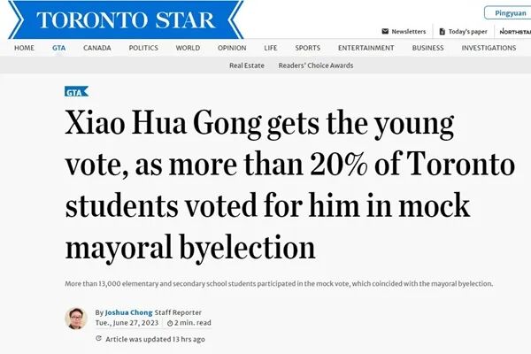 据悉,“多伦多星报”6月27日以《龚晓华获得年轻人选票,模拟市长补选超过20%多伦多学生投票给他》为题做了报道,说“龚晓华无疑吸引了多伦多市的年轻人,在模拟市长补选中获得近22%支持率,这在所有候选人中名列第二”。
