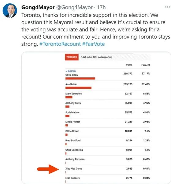 龚晓华在推特上写道:“我们对这个市长选举结果提出质疑,并认为确保选举的准确性和公正性至关重要,因此,我们要求重新计票。”