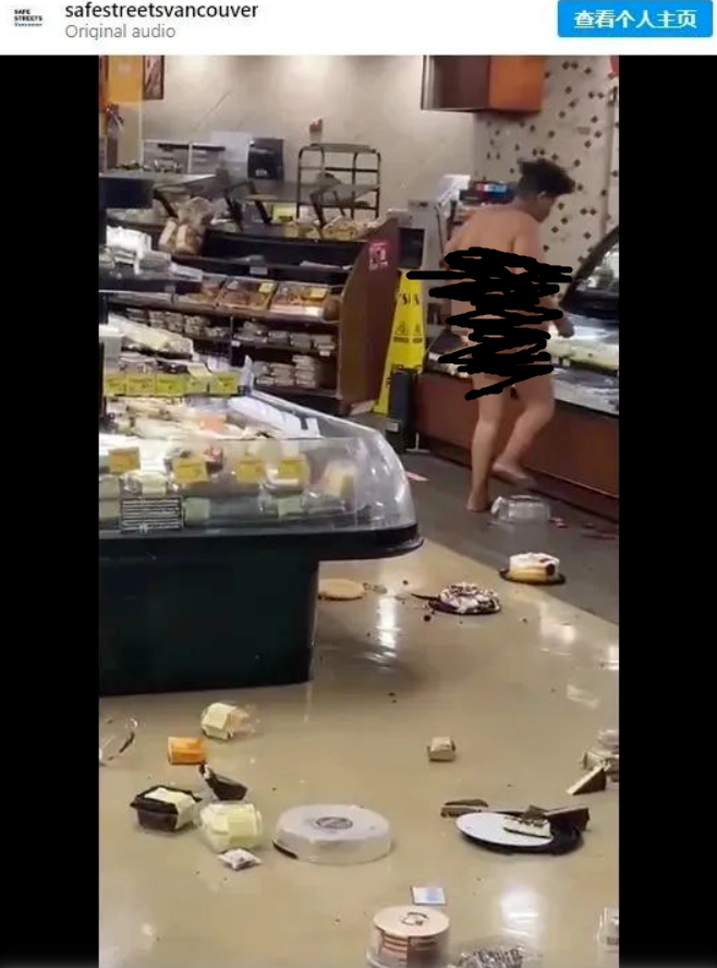 当时小L正在火锅店外停车,突然看到三名警察押着一名亚洲面孔的全裸男子离开。该男子上半身赤裸,警察用一个黑色垃圾袋将他的下半身重要部位遮挡住。目前还不清楚具体情况,据现场目击小伙伴称,中午吃完饭就看到一堆警察来了,还以为是巡逻,直到警察从火锅店把人押出来。只见他脚步趔趔趄趄,还险些栽倒,疑似醉酒状。看样子是真没少喝,也不知道当事人是遇到多大的挫折想不开。事后,有网友曝光,在此之前,这名男子还一丝不挂地在附近的居民区裸奔...这时可没有警察的垃圾袋遮挡,画面简直辣眼睛!这场面实属罕见,而且还在华人区!无独有偶,就在近日,温哥华也发生了一起有过之而无不及的疯狂事件。据Instagram上的一段视频曝光,一名全裸女子在温哥华超市疯狂搞破坏,乱丢食物。据爆料网友称,事情发生在本周五,具体时间尚不清楚,地址是位于温哥华的Granville和71街的知名连锁超市Safeway内。视频显示,超市一片狼藉,被砸碎的啤酒瓶玻璃渣散落一地,以及满地的蛋糕甜点。一名全裸女子正在甜品柜台继续乱扔,甚至将蛋糕抹到自己的身上。画面极度引人不适。不过,截至本文发文前,这段视频已经被删除。提醒大家,生活压力大也不能轻易放飞自我,以免清醒后面对社死压力更大。