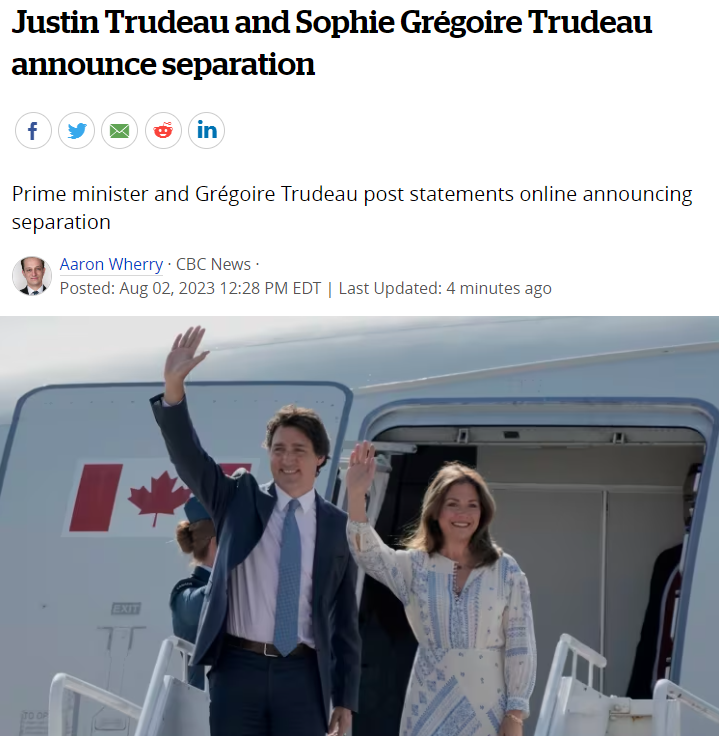 就在刚刚,加拿大各大媒体头版头条刊登了一则重大突发:加拿大总理特鲁多与妻子分手!