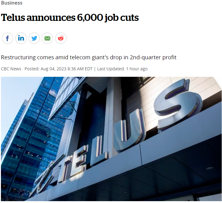今天上午,加拿大著名电信运营服务商Telus宣布裁员6000人。