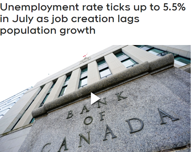 此前,该比率连续九个月徘徊在5%的水平,略高于去年夏天创下的4.9%的历史低点。但加拿大的一些专家并不认为失业率上升是高利率导致的,而是新移民人数快速增加导致的。当加拿大人口持续快速增长,而经济又没有能力创造足够的就业机会来吸纳更多的劳动力时,才导致失业率上升。这份报告还指出各省失业率没有太大波动,其中纽芬兰,爱德华王子岛,新不伦瑞克省,安省和BC省都略有下降,曼省和萨省略有增长,魁省也有0.1%的增长。相比之下,新斯科舍省失业率增长幅度较大,从从6.4%增加到7.7%。https://www.ctvnews.ca/business/telus-announces-6-000-person-layoff-1.6506643https://www.ctvnews.ca/business/unemployment-rate-ticks-up-to-5-5-in-july-as-job-creation-lags-population-growth-1.6506574