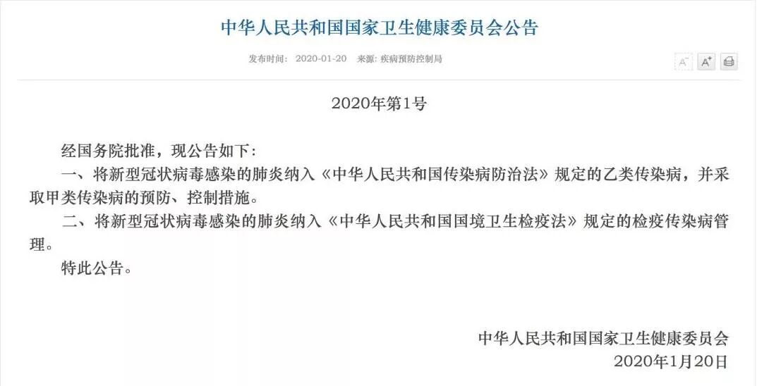 一、将新型冠状病毒感染的肺炎纳入《中华人民共和国传染病防治法》规定的乙类传染病,并采取甲类传染病的预防、控制措施。