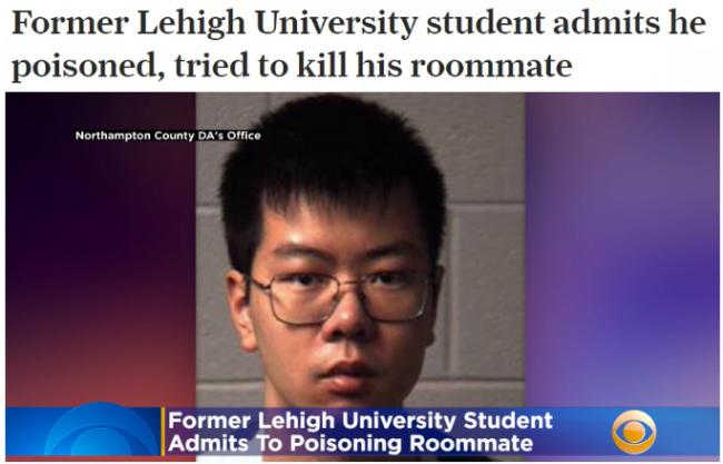 美国宾夕法尼亚州一名中国留学生周一(11月30日)承认在黑人室友的食物和饮料中放入重金属,令对方中毒。他承认“企图谋杀”,面临6至20年监禁。