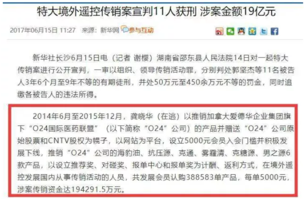 报道中指出,在逃嫌犯龚晓华以推销加拿大爱德华集团旗下的O24和CNTV为幌子,在境外遥控发展国内从事传销活动的人员,涉嫌传销资金高达19亿人民币。随后,龚晓华发起反击,在加拿大高调召开新闻发布会。不仅否认全部指控,还声称要回中国上诉为自己讨回清白。