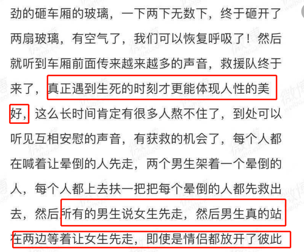 然而幸运的是,她最终等来了救援。在大家都经历着生死存亡的时刻,本应当是最能体现人性弱点的时候,却看到了人性的美好,大家互相安慰着,互相扶持着,让孕妇,孩子和女性先出去。
