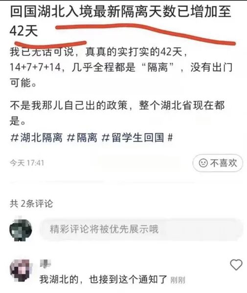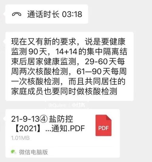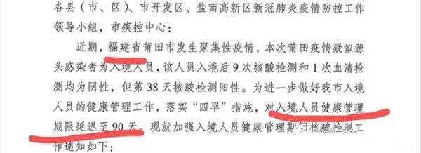 最近,不少刚回国的网友在社交媒体上反映,因福建疫情持续,全国多个省市的入境隔离政策正相继升级。比如有网友称,目前湖北的入境隔离时间已经是42天了。但另一位网友则爆料称,“没那么短,我回国后集中隔离再加上居家健康监测的时间,长达90天!”这位网友表示,他是从新加坡飞广州,集中隔离14天后,再点对点无缝衔接到家乡江苏盐城,又集中隔离了14天。28天后,他刚觉得要自由……没想到被告知,马上再隔离62天,名为“入境人员居家健康监测”!对于这90天的说法,该网友还亮出证据,一份针对入境人员健康管理期限延至90天的正式文件:文件明确表示,由于福建莆田疫情疑似源头感染者为入境人员,该人员入境后第38天核酸检测为阳性,因此对入境人员健康管理期限延迟至90天。该网友表示,前一天自己刚在隔离点做完核酸,到家第一天就又通知我和我妈去做核酸……在将这次核酸检测的信息上报社区后,社区工作人员又告知该网友,今后须在何时何地进行几次核酸检测,而且家人也要一起测。有网友留言询问:新增在家62天的健康监测期间可以外出吗?该网友表示,他被告知不可以进入密闭的公共场合。如果需要外出,必须先向所在居委会报备,然后等通知。该网友还透露,居家检测是免费的,由居委会工作人员上门来做。对于居家健康监测期间能否外出的问题,广东省政府此前曾明确规定:居家健康监测期间的外出仅限于必要目的。该规定同时指出,就“出行”而言,居家隔离人员必须做到足不出户,居家健康监测人员则可以做好防护后出门,并限于必要目的,同时应避免参加聚集性活动。据报,杭州市卫生健康委曾通报一名国外入境人员金某某,在入境集中隔离解除后,在居家健康观察和日常健康监测期间擅自离开居住场所外出购物并旅游。8月10日,金某某被确诊为无症状感染者。因金某某违反疫情防控规定,当地公安部门已依法对其立案调查。总结来看,目前江苏盐城的政策是14+14+62共计90天,也就是说,你有至少3个月的时间无法自由行动。想现在回国,你还真得做好心理准备,算算时间成本。除了这位江苏网友之外,另有网友爆料,目前湖北的入境隔离时间已增加到42天。而且是实打实的隔离42天,没有出门的可能。