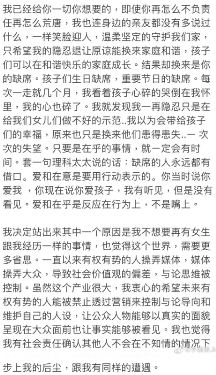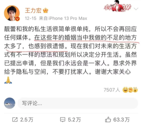 谁也没想到,昔日的情歌王子,被称为“纯净水男神”的王力宏,人设一夜轰塌。12月17日深夜,王力宏官宣离婚后的一天他的前妻李靓蕾发长文控诉王力宏长期家暴,招妓,约炮,缺席孩子成长,离婚是为了和第三者在一起。