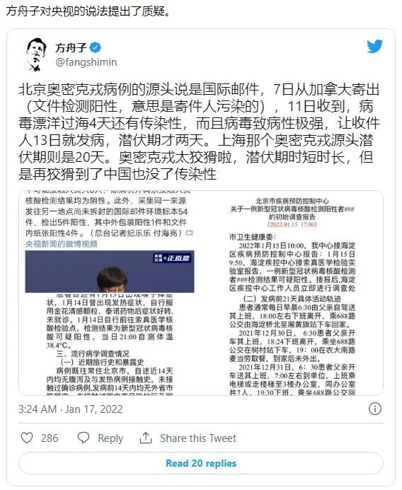 据北京日报,1月17日,北京市疾控中心副主任、全国新冠病毒肺炎专家组成员庞星火通报了“海淀区新冠肺炎确诊病例的溯源情况”:“北京(海淀)1月15日通报的一例本土新冠肺炎确诊病例被检测出奥密克戎(Omicron)变异株特异性突变。”作为北京首例奥密克戎感染者,该确诊病例自述“近期曾收到加拿大寄出的国际邮件”。