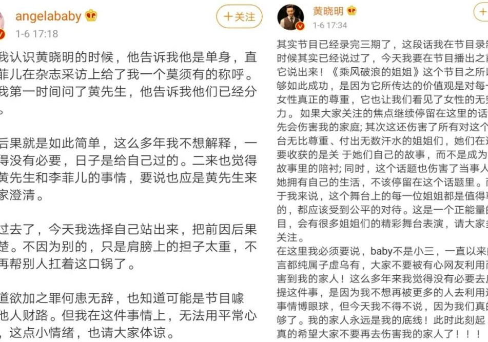 北京时间1月28日中午12点左右,黄晓明、angelababy同时发文,官宣离婚。