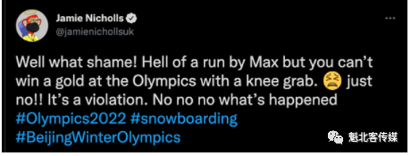 就连跨界的运动员都表示看不下去了,英国车手杰米尼科尔斯在推特上表示:“丢人!Max表现得是挺好的,但是你不能在奥运会上抓膝盖也拿金牌吧?就是不行!这是犯规啊!No!No!No!重要的事情说三遍啊……”Slush Magazine 的编辑总监Stan Leveille发文表示:“通常情况下,我愿意接受某种程度上的不合理,但是这次是TMD偷走了整个蛋糕啊,补充一点,不是针对Max,而是针对那些给他金牌的XX裁判们。”大量网友要求裁判“解释错误”(其中也包括加拿大铜牌得主马克迈克莫里斯的粉丝),面对大批判的总裁判长,终于在接受老牌单板媒体Whitelines采访时承认——“判错了!”裁判长回答:“裁判根据看到的进行打分,我们从摄像机提供给我们的角度来看那就是个干净漂亮的动作,我还需要提醒很重要的一点,我们裁判需要在几秒钟内给出分数,因为是直播,所以时间上给的压力也很大。”裁判长答道:“没有,因为我们从拍摄画面中看到的动作干净漂亮,再说一次,我们根据我们所看到的打分,并且我们所有人都对自己看到的觉得比较有自信”。记者又问道:“如果有问题,你们会要求重播该动作吧?所以没有人要求看重播,就因为看上去干净漂亮?”