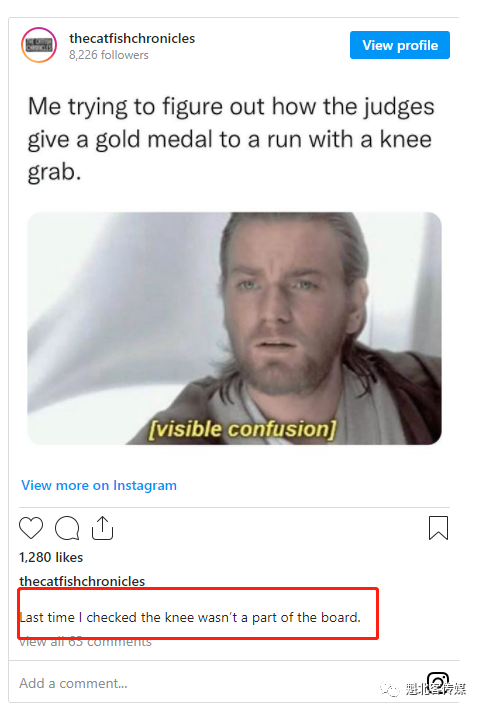 滑雪博主大号专门制作了表情包来讽刺这个“抓膝盖”的动作“这是个10/10的笑话”。