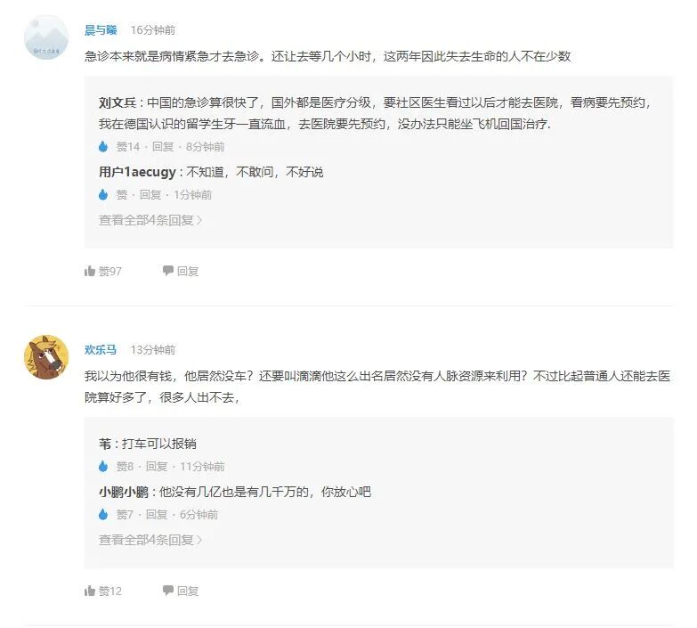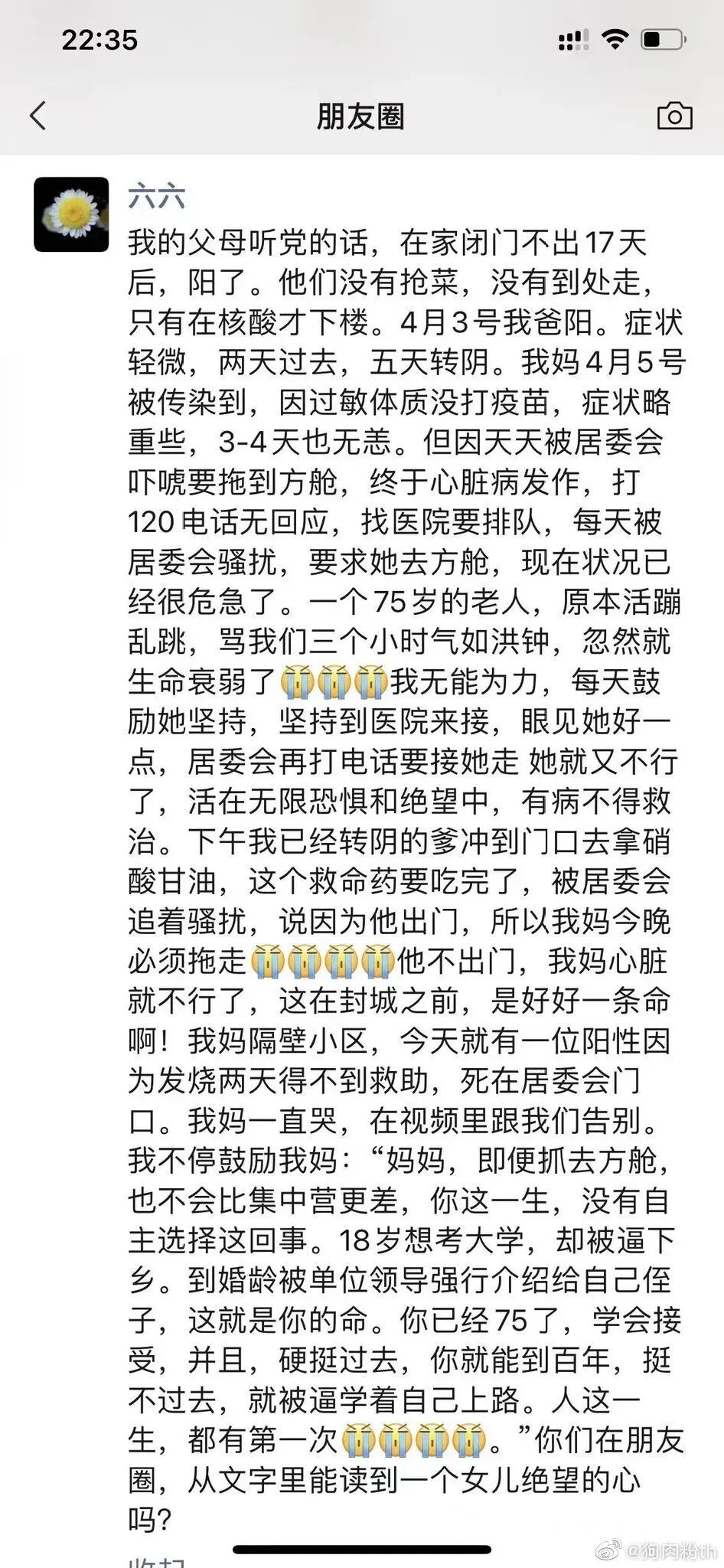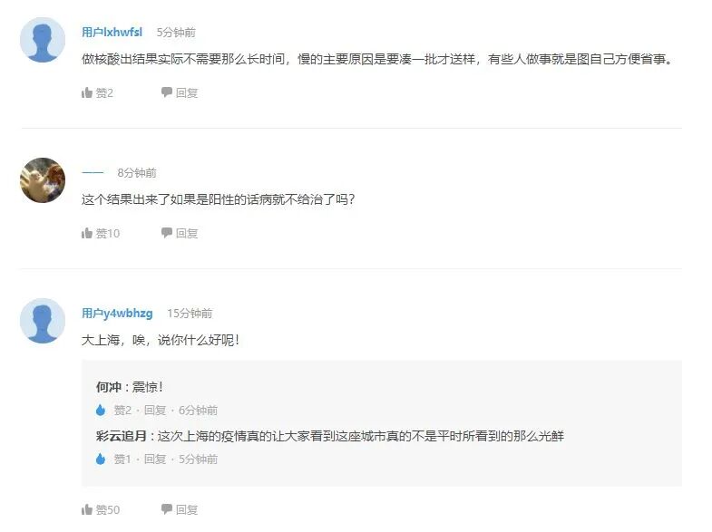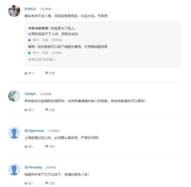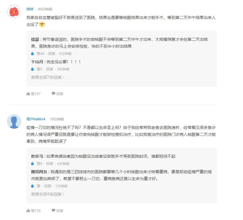 因为我妈妈年纪很大了,98岁,老年人身体器官都不会太健康,这次我妈妈的肾脏有一点点衰竭,按照过去的诊断,只要打一针就好了。只是因为上海严格规定必须要做核酸后才能就医,我妈妈在三甲医院当场做的核酸竟然4个小时都没出结果,我深感震惊。