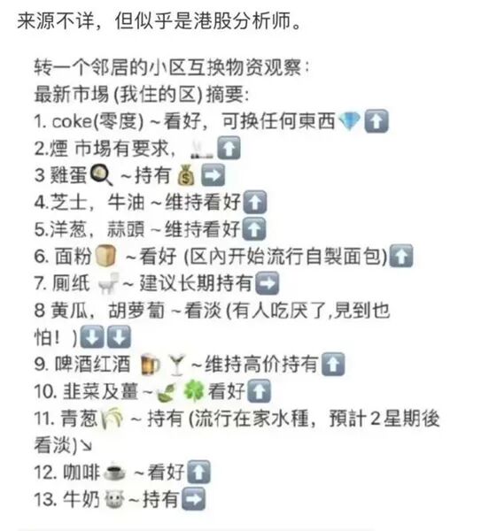 牛肉饼换米面油,半瓶朗姆酒换4个蛋挞……在各色交换中,零度可乐可以换任何东西……此外,“青椒”和“葱、姜、蒜”成了硬通货,因为配给的蔬菜包中不常有……起初,邻里之间多是以“食物易食物”,随后,跨物种的交换越来越离奇: