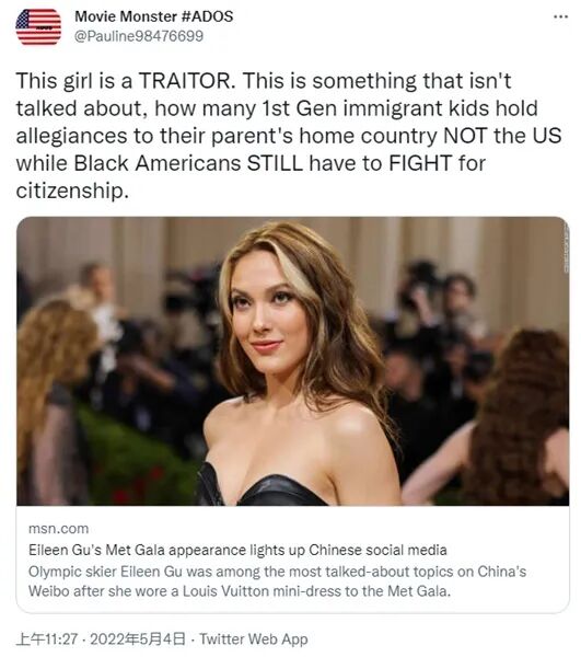 “对许多美国人来说,这位18岁的天才少女已经被贴上了叛徒的标签。想成为亚裔美国人?只有她代表美国拿了牌,我们才认!”