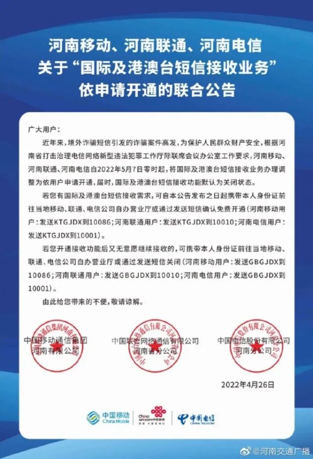 公告内容与此次浙江发布的相近,不同的是,河南针对的短信业务,自2022年5月7日零时起,将国际及港澳台短信接收业务办理调整为依用户申请开通,届时,国际及港澳台短信接收功能默认为关闭状态。