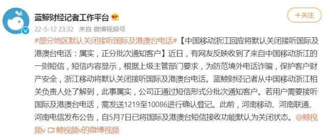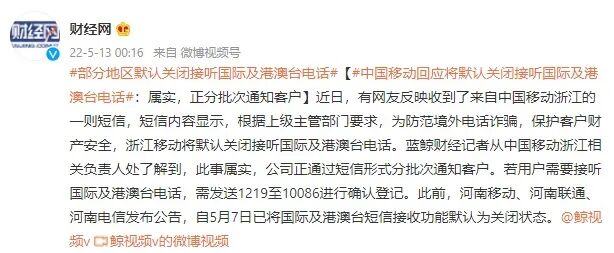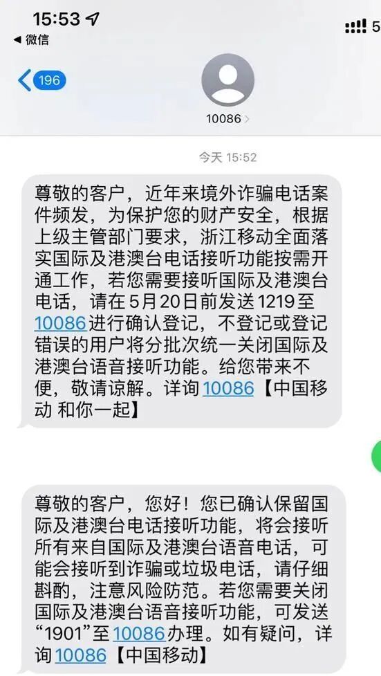 该短信内容显示,近年来境外诈骗电话案件频发,为保护客户的财产安全,根据上级主管部门要求,浙江移动全面落实国际及港澳台电话接听功能按需开通工作,若需要接听国际及港澳台电话,要求在5月20日前发送1219至10086进行确认登记,不登记或登记错误的用户将分批次统一关闭国际及港澳台语音接听功能。言下之意,移动方面将默认关闭接听国际及港澳台电话。有需要的,要在既定时间内自行发短信进行开通。在按照指导,发送“1219”登记信息后,则会收到新的短信,提醒用户已确认保留国际及港澳台电话接听功能,将会接听所有来自国际及港澳台语音电话,可能会接听到诈骗或垃圾电话,要求仔细斟酌,注意风险防范。若需要关闭国际及港澳台语音接听功能,可发送“1901”至10086办理。针对此事,国内媒体“蓝鲸财经”记者向中国移动浙江相关负责人了解,证实此事属实!据了解,该公司正通过短信形式分批次通知客户。无独有偶,4月底,河南移动、河南联通、河南电信发布了关于“国际及港澳台短信接收业务”依申请开通的联合公告。