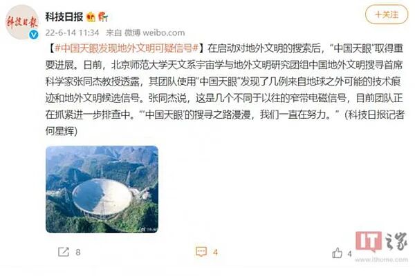 据科技日报报道,北京师范大学天文系宇宙学与地外文明研究团组中国地外文明搜寻首席科学家张同杰教授日前透露,在启动对地外文明的搜索后,“中国天眼”取得重要进展——其团队使用“中国天眼”发现了几例来自地球之外可能的技术痕迹和地外文明候选信号。