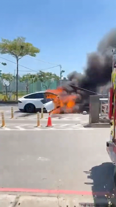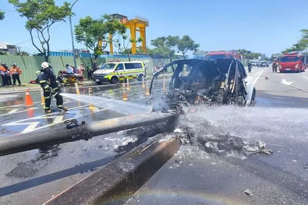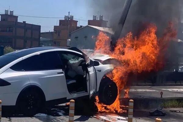 据台媒报道,7月22日上午,桃园市中正北路发生一起严重车祸。一辆白色特斯拉自撞桥墩、车头起火。现场火势相当猛烈。