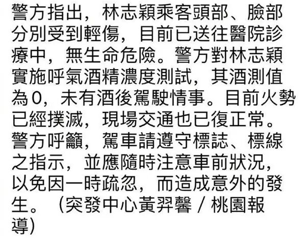 林志颖当时坐在驾驶座上,头部受伤,一度无法说话,而副驾驶座的儿子则是脸部擦伤。