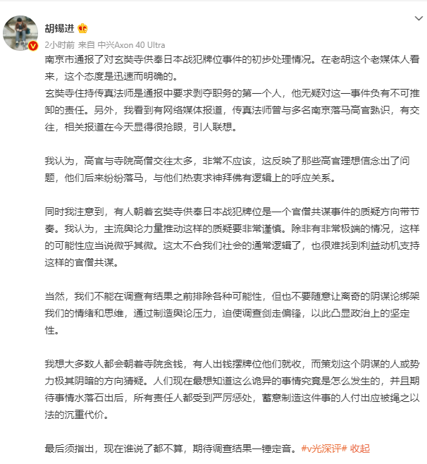 炸了!南京玄奘寺供奉日本战犯,疑点重重。胡锡进称有阴谋和阴暗力量