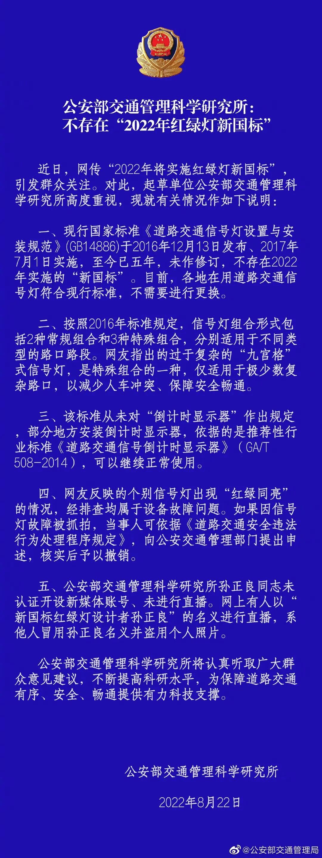 22日晚,“2022年将实施红绿灯新国标”(草案)的起草单位,公安部交通管理科学研究所紧急作出回应称: