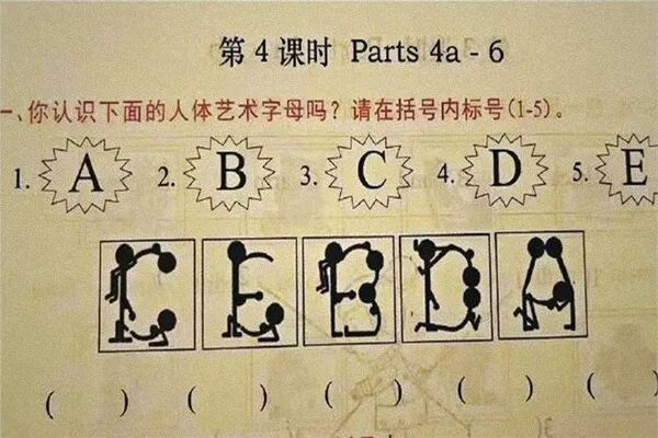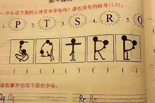 中国人民教育出版社出版的小学数学教材插图事件才刚消停,近日,教材争议又起一桩!在一本被指为“新疆文化出版社出版”的英语练习册中,有一张“人型字母”习题配图,其字母变形后的画面被指“具有高度性暗示”。