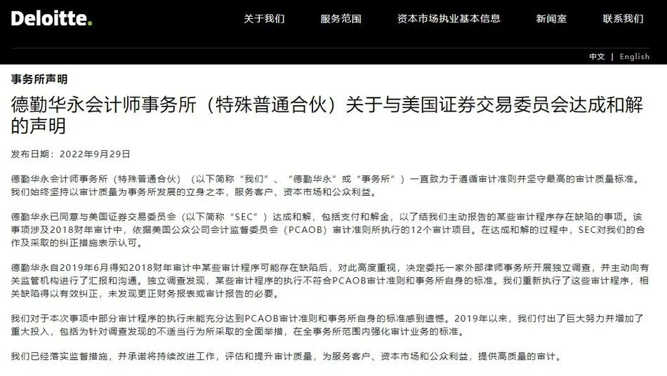 路透社29日报道,美国证券交易委员会指出,德勤中国违反相关规定,容许包括在美国上市的中国企业客户自行审计。