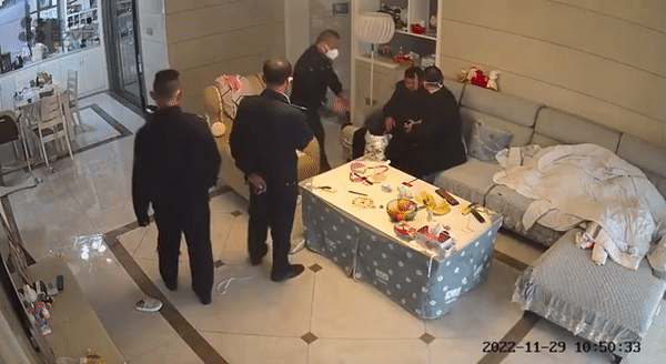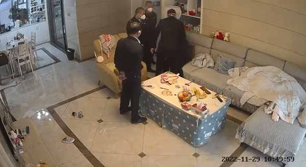 最让人心碎的是,业主家中两个年幼的孩子跑入画面,看到此景大声哭喊,并叫“爸爸妈妈”,被两名警察带出现场。