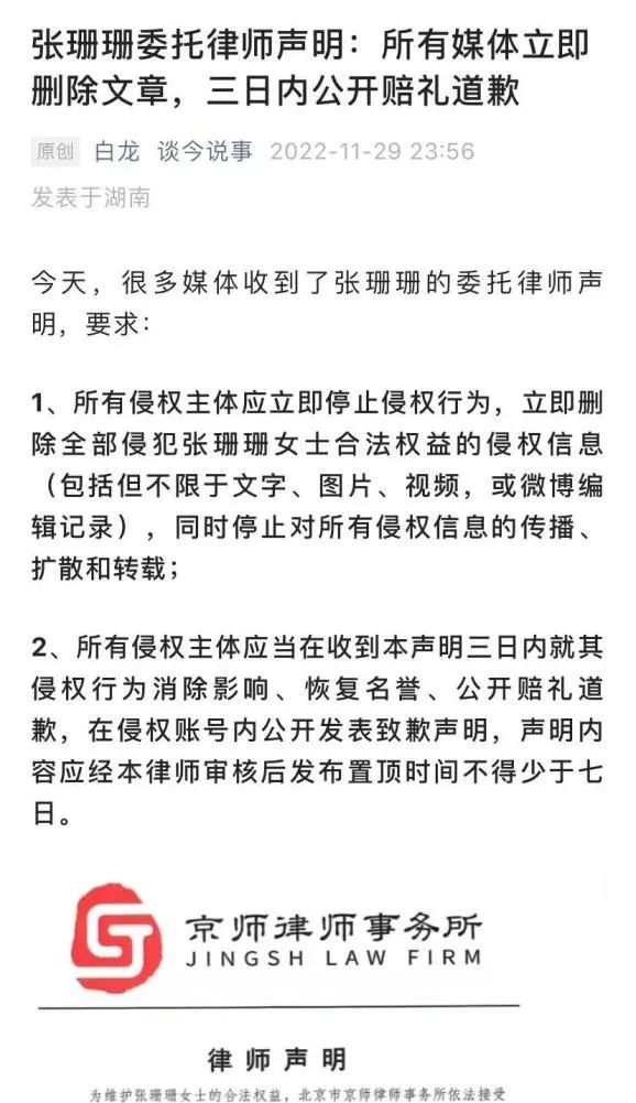 11月29日凌晨,自媒体博主"谈今说事"发布一篇名为《张珊珊委托律师声明:所有媒体立即删除文章,三日内公开赔礼道歉》的文章,文中提到包括自己在内的"很多媒体收到了张珊珊的委托律师声明",被要求删除侵权信息、消除影响并公开致歉。