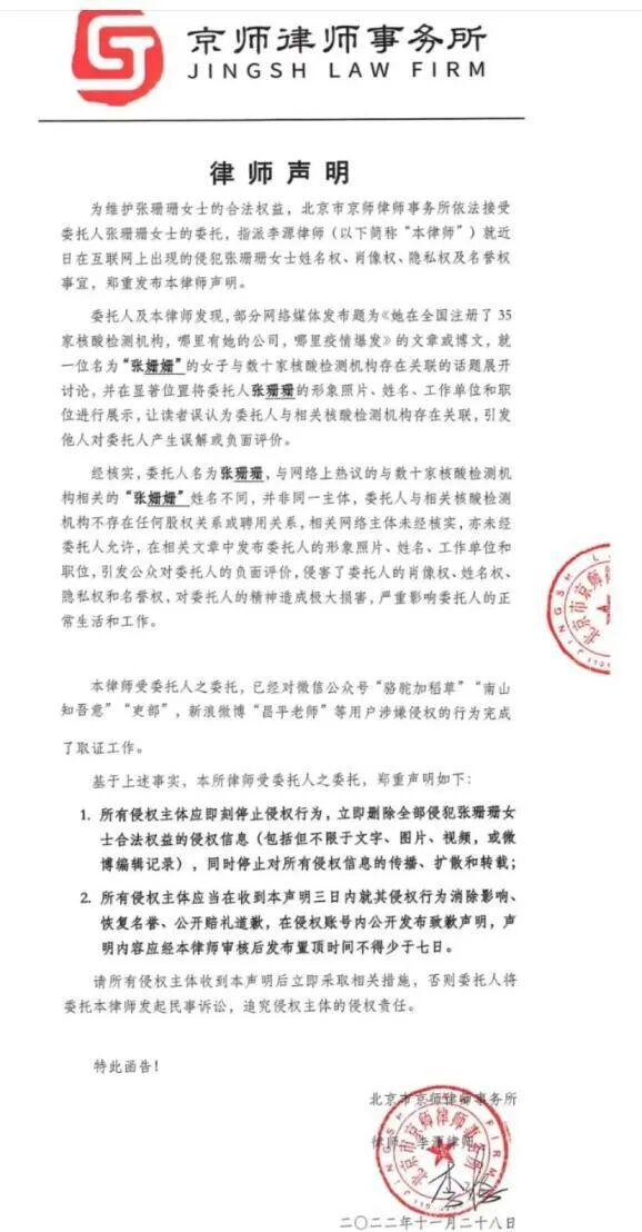 根据该博主发布的信息,该“律师声明”为北京市京师律师事务所“依法接受委托人张珊珊女士的委托,指派李源律师就近日在互联网上出现的侵犯张珊珊女士姓名权、肖像权、隐私权及名誉权事宜”发布。该“律师声明”中指出,部分网络媒体发布的题为《她在全国注册了 35 家核酸检测机构,哪里有她的公司,哪里疫情爆发》的文章和博文,将委托人“张珊珊”的形象照片、姓名工作单位和职位与相关讨论中提到“张姗姗”进行对应展示,以致令读者认为委托人“张珊珊”与相关核酸检测机构存在关联,进而对委托人产生误解或负面评价。“律师声明”中明确提到,委托人“张珊珊 ”与网络上热议的与数十家核酸检测机构相关的“张姗姗”“并非同一主体”,并要求发布相关内容的自媒体立即删除相关信息,发布不少于7日的公开致歉声明等。记者在网络上搜索发现,不少信息发布者在发布文章时,确有将“张姗姗” 与“张珊珊”相混淆的情况存在。11 月 30 日下午,记者致电北京市京师律师事务所,与李源律师取得了联系。李源律师告诉记者,该“律师声明”确是己方律师事务所发出的,“委托人是‘天眼查’的前高管张珊珊女士。”李源律师对记者说,之所以发布“律师声明”,是因为网上有些自媒体误将其委托人张珊珊与近日引发网络热议的核酸检测机构相关的张姗姗相混淆。“双方是不同的主体,我们也不认识和几十家核酸检测机构相关的张姗姗。我们的委托人和这件事没有任何关系。”“我们的律师声明并没有公开发布……我们只给曾发布委托人照片的网文作者私下发去了律师声明……相关自媒体公开‘律师声明’并未征求我们的同意。”