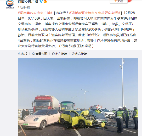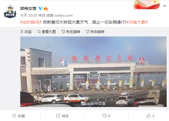 10点10分,郑州交警在其官方账号上表示,郑新黄河大桥因大雾天气,禁止一切车辆通行。随后,郑州警方发布消息称,受影响路段的交通已于下午恢复。