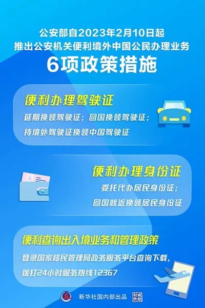 公安部2月1日发布公告:为深入推进公安机关便民利企改革,进一步便利境外中国公民办理身份证、驾驶证等业务,便利回国后正常使用证件,公安部自2023年2月10日起,推出“公安机关便利境外中国公民办理业务6项政策措施”。