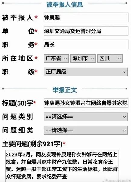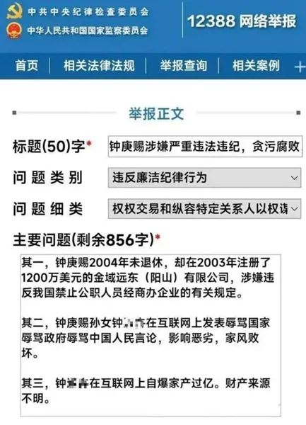 此外,还有举报者依照钟先生孙女,即“北极鲶鱼”近日网上所述,称钟先生家中“财产九位数,日常吃食帝王蟹……远超一般干部正常工资下的生活标准”……