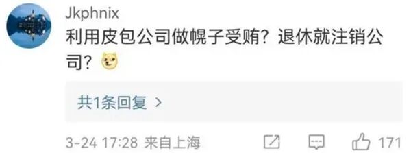 有网友猜测其“利用皮包公司做幌子受贿?退休就注销公司?”
