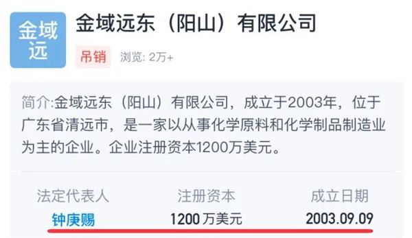 疑似钟先生的公司——金域远东(阳山)有限公司的工商信息页面显示,该公司的工商牌照显示为“吊销”,但其“法人姓名,注册资本及成立日期”仍清晰在列。