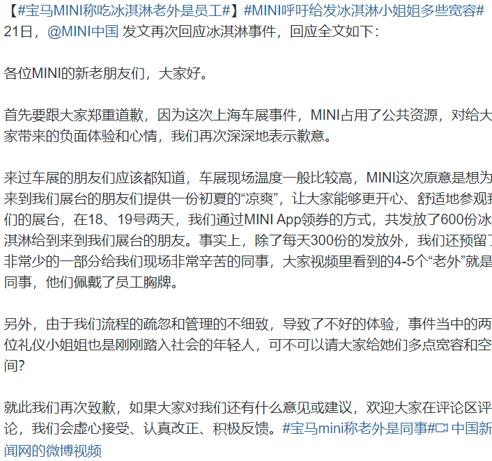 下午14时许,@MINI中国发布微博开始道歉,并解释说,“上海车展现场礼-甜宠”活动的本意是给逛展的大小朋友送上一份甜蜜……但因“内部管理不细致”以及“工作人员失职”,引起大家不快。