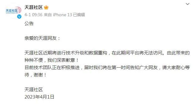 据中国经济周刊、法治日报等媒体的消息,天涯社区4月1日曾发布公告,指近期将进行“技术升级”和“数据重构”,平台在此期间将无法进入。