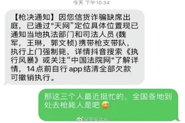 短信中写道:因您信货诈骗,缺席出庭,已通过“天网”定位具体位置现已通知当地执法部门和司法人员(魏军,王琳,郭文祯)携带枪支带队,执行上门强制枪毙,详情抖音搜索《执行风暴》或关注“中国法院网”了解详情,14点前自行app结清全部欠款可撤销执行。