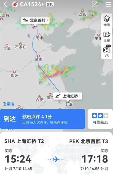 据查,该次CA1524航班从上海(虹桥T2)飞往北京(首都T3),计划起飞时间为7月10日14:45,抵达时间为16:55;实际起飞时间为15:24,抵达时间为17:18。