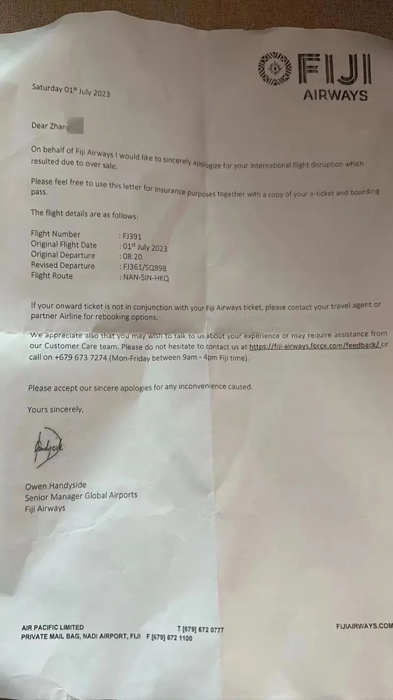 花钱买了机票却无法登机,被迫更改航班乃至到别的国家被滞留。最近,张女士原本期待的一场斐济休闲旅行,因航空公司超售而成了一场愤怒的维权之旅。张女士向记者报料,她和友人原定于7月1日结束旅游从斐济回国,当天却因为航空公司超售而被拒绝登机,和她一样买了机票却无法登机的,加起来一共有20名中国人。中国驻斐济大使馆告诉记者,该馆已经并将继续通过斐济旅游局及航空主管部门向斐航表达关切和对此事的重视。经了解,斐济航空已就超售改签向未如期登机人员出具了情况说明和书面道歉信。7月10日,记者了解到,斐济航空中国办事处已向张女士和其他索赔乘客收集了当天住宿费和车费信息,具体如何赔偿则仍未有结论。张女士告诉记者,前不久,她和友人共三人前往斐济游玩,找旅行社帮忙安排行程并购买机票,原定于当地时间7月1日8时20分乘坐飞机从斐济回香港。回程的前一天晚上,她们在旅行社的提醒下在网上提前值机,发现已经无法操作,只能于1日凌晨5时赶到机场值机,却在现场被告知无法办理登机。“他们把我们的行程改到了7月3日,还说是我们自己改的行程,一直不承认超售,从5点多一直僵持到8点,后来工作人员才松口说他们确实超售了,给我们开了超售证明。”张女士发现,同一航班无法登机的有20名中国乘客和2名外国乘客。“那两个外国人自己加钱加了大约2700斐济币,折合人民币大概七八千块钱,升了商务舱走了。”记者注意到,机票超售,是指超过航班最大允许座位数的销售行为,在航空业界很常见,因为乘客临时取消订票或者因故无法搭乘飞机的情况时有发生,而航空公司营运成本高,为了降低航班经常无法满座造成的亏损,会通过超售机票,让超售部分的乘客自动补上空缺。但如果没有人取消航班,超售则会造成部分乘客“买了票却无法登机”。各国的超售政策一般要求承运人在超售时优先考虑自愿放弃航班的旅客,并给予他们合理的补偿和安排。如果没有足够的自愿者,承运人必须给予非自愿被拒绝登机的旅客相应的补偿和安排。“正常超售情况下,航空公司应该首先去询问有没有人自愿更改航班,但整个过程中我们没人接到这个询问,比如说提前发邮件问你想不想自愿更改到3号的航班,我们这20人没有一个人收到这样的信息。”张女士说:“而且正常超售是谁先值机谁就先登机,但他们也没有做到,我们那天提前到的,甚至有人提前三天就在网上值机的,都没有登机,后面陆陆续续有些外国人来了,他们反而能正常登机,我也没搞懂他们的筛选机制。”张女士称,在她们协商处理的过程中,斐济航空没有人专门对接,“他们一直赶我们去旁边待着,不要影响他们,连给我们拿一瓶水,或者说安抚我们一下都没有。”后来,她们向中国驻斐济大使馆打电话求助,大使馆派了志愿者来帮助协调,“大使馆还给我们拿了一些水,就觉得我们很辛苦,从凌晨4点起来,5点到机场,一直等到11点。”在中国驻斐济大使馆的帮助下,20名中国乘客中有12名最终登机,乘坐原定航班回国,因该航班已满座,包括张女士在内的8位乘客被安排到新加坡转机回香港。“我们当时有一个顾虑是到了新加坡后,如果赶不上到香港的飞机,我们也没有新加坡签证,就属于非法滞留了。斐济航空向我们保证说绝对不可能误了航班,肯定能飞的,我们就去排队办理飞新加坡的值机,一直排到11点。到了新加坡,我们中又有两个人的航班被取消了,当时也没有任何人去跟他们对接,后来他们两个人在机场滞留了一晚上,第二天早上才飞回到香港。”记者致电斐济航空,截至发稿未获回复。中国驻斐济大使馆则回复记者称,该馆已经并将继续通过斐济旅游局及航空主管部门向斐航表达关切和对此事的重视。经了解,斐济航空已就超售改签向未如期登机人员出具了情况说明和书面道歉信,信中也提到了该信可以作为保险申诉的证明,提供了售后联系方式。建议组团社或无组团社的游客保留好相关证据,如有需要,可向斐济航空或保险机构提出理赔诉求。“我们现在想让更多人知道,不能让斐济航空随意欺负我们,也要航空公司给我们相应的赔偿。”张女士说。7月10日,记者了解到,斐济航空中国办事处已向张女士和其他索赔乘客收集了当天住宿费和车费信息,具体如何赔偿则仍未有结论。