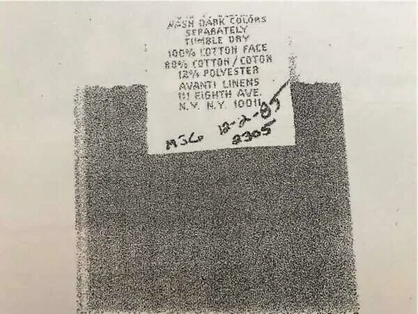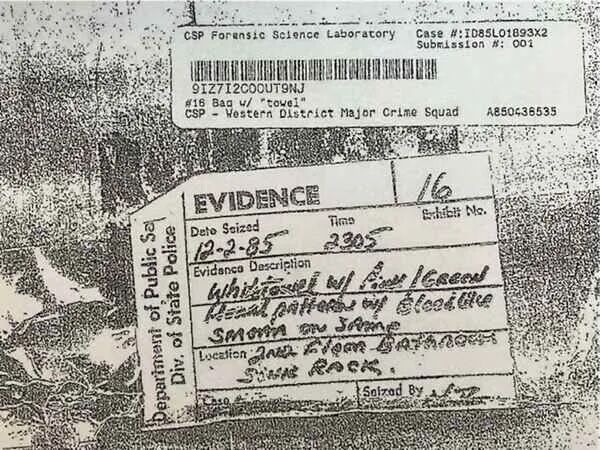 当我审查我手头拥有的案件材料时,我找到了放置在毛巾证据袋上的证据标签的副本。标签上清楚地写着:“物证16,收集日期为12-2-85. 时间:2305,物证:白毛巾,带有粉红/绿色(难以辨认)图案,带有类似血迹的污渍,地点:二楼浴室水槽架...”。