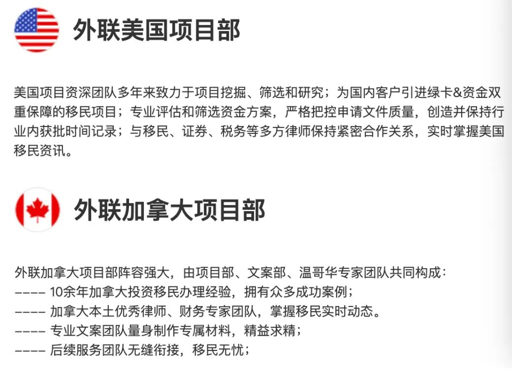 网站也宣传了该公司的一些海外移民项目,涉及美国和加拿大。资料显示,该公司在加拿大温哥华有专家团队。↓↓↓